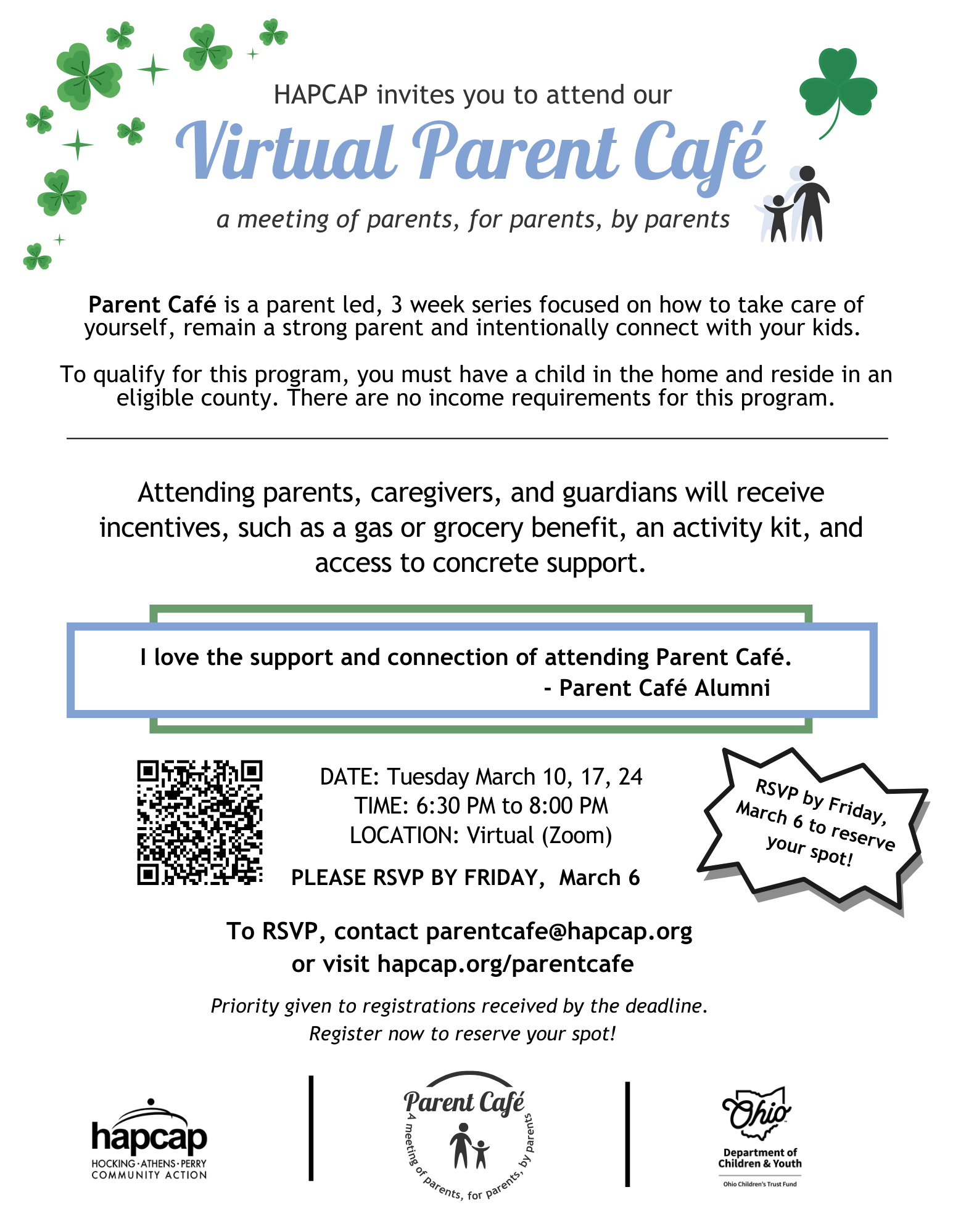 Parent Cafés are led by parents and offered in a both virtual and in-person formats. Cafés are primarily open to residents of Hocking, Athens and Perry, although it is possible for parents that live in the other counties within OTCF's Southeast Ohio Region to participate. If you do not live in Hocking, Athens, or Perry Counties, please contact us and we will work with you on a case by case basis.