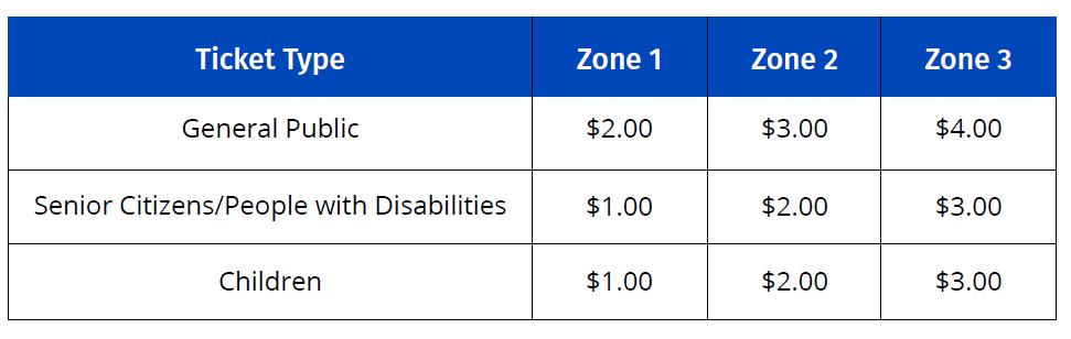 The fare a rider pays is based on where they travel within our three travel zones, and the ticket type.